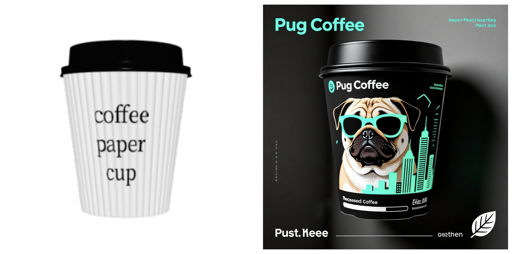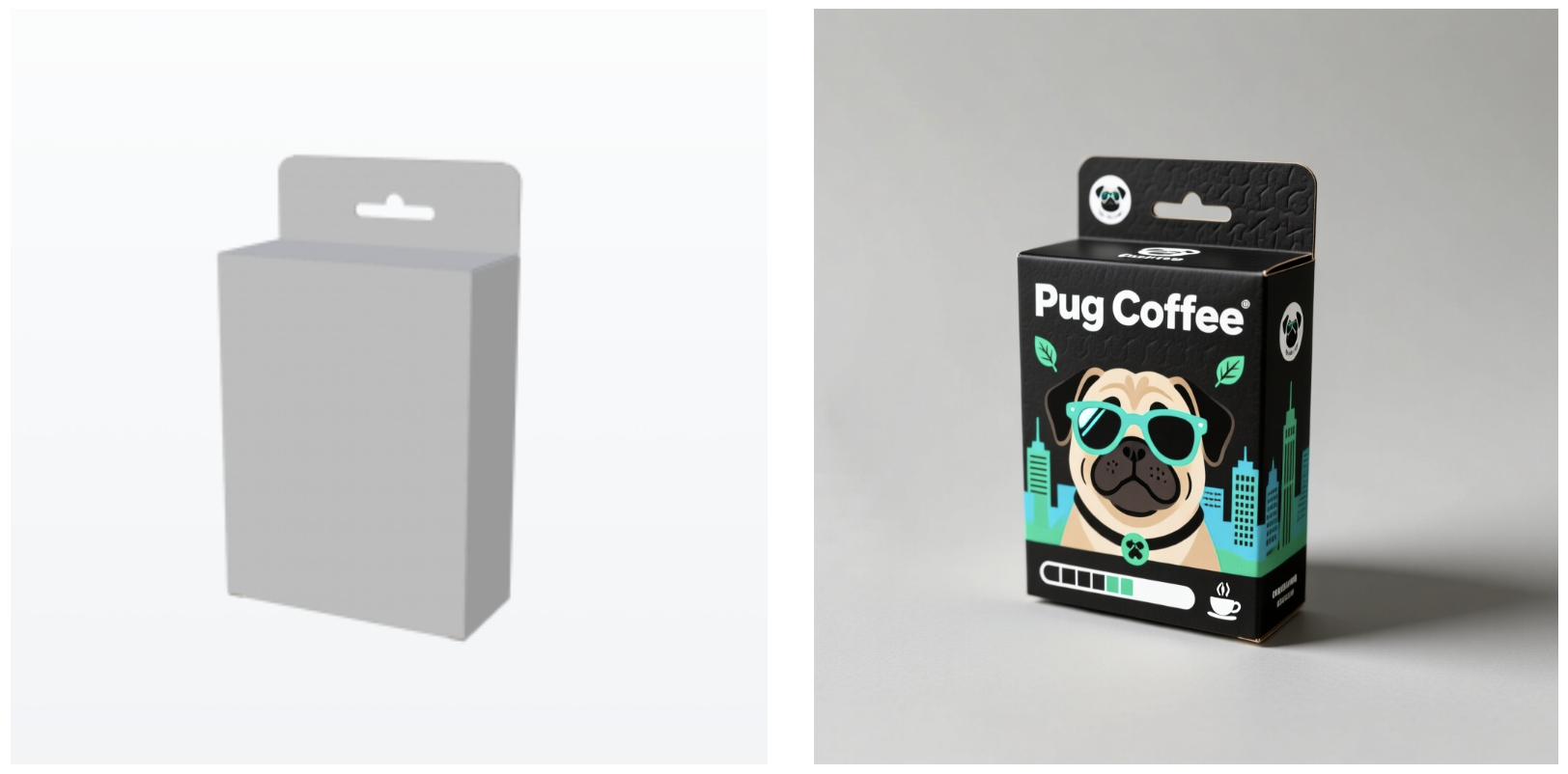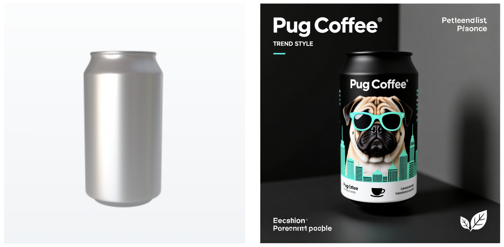 创意描述:逼真的工作室渲染图,哑光炭黑色底色,一只戴着蓝绿色太阳镜的酷 Pug 犬大型平面图案从正面延伸至左侧,Pug 犬的鼻子和顶部 “Pug Coffee” 标志处有局部 UV 光效,侧面面板饰有电光蓝绿色几何城市天际线图案,正面底部有白色浓缩咖啡浓度标识条,还有精致的压印生态叶片图标,左侧打柔和主光,背景为中性灰色,景深较浅。 | |