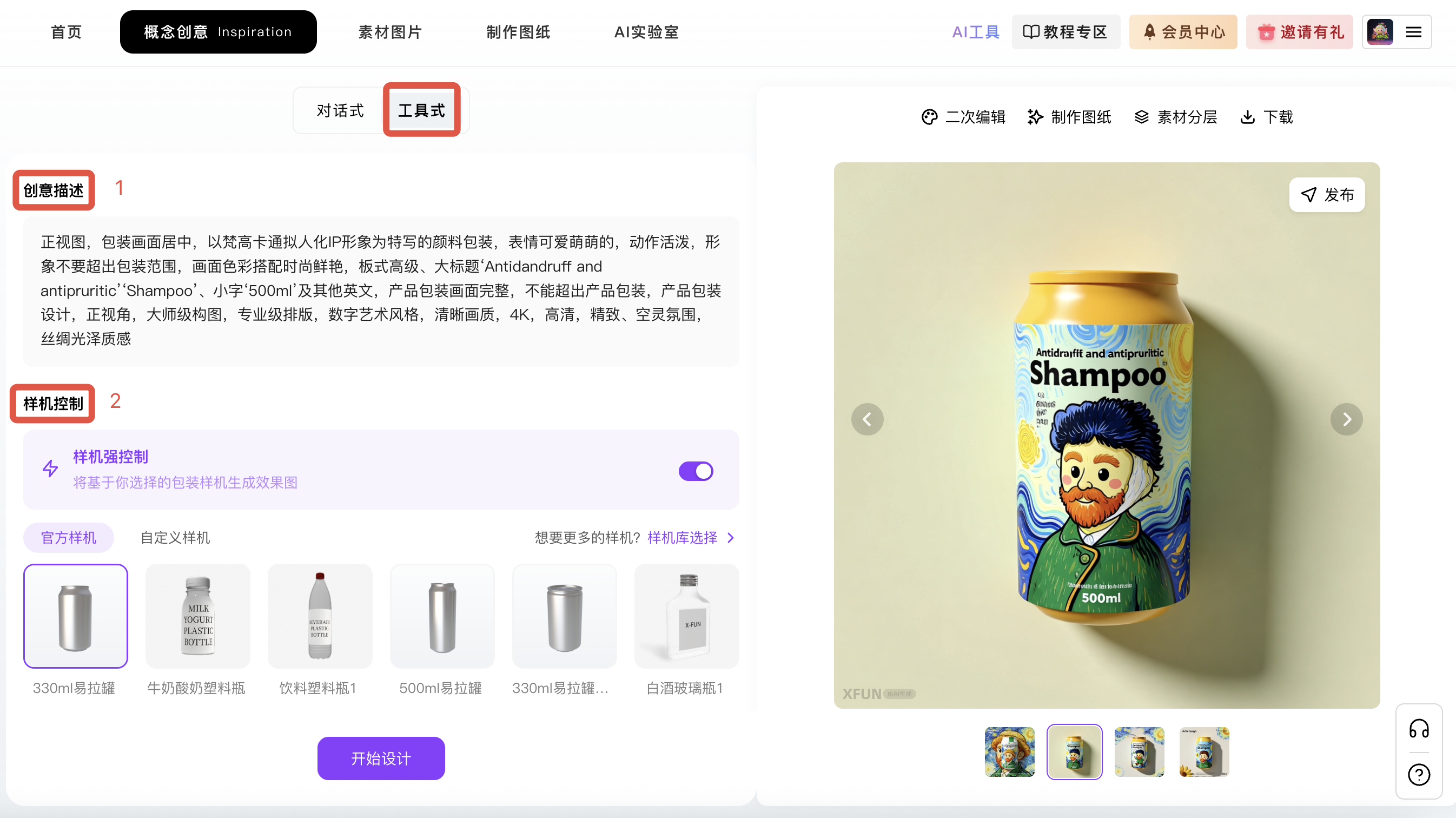 使用【工具式】,可以选择包装白模图,即可生成可控包装形式的创意。