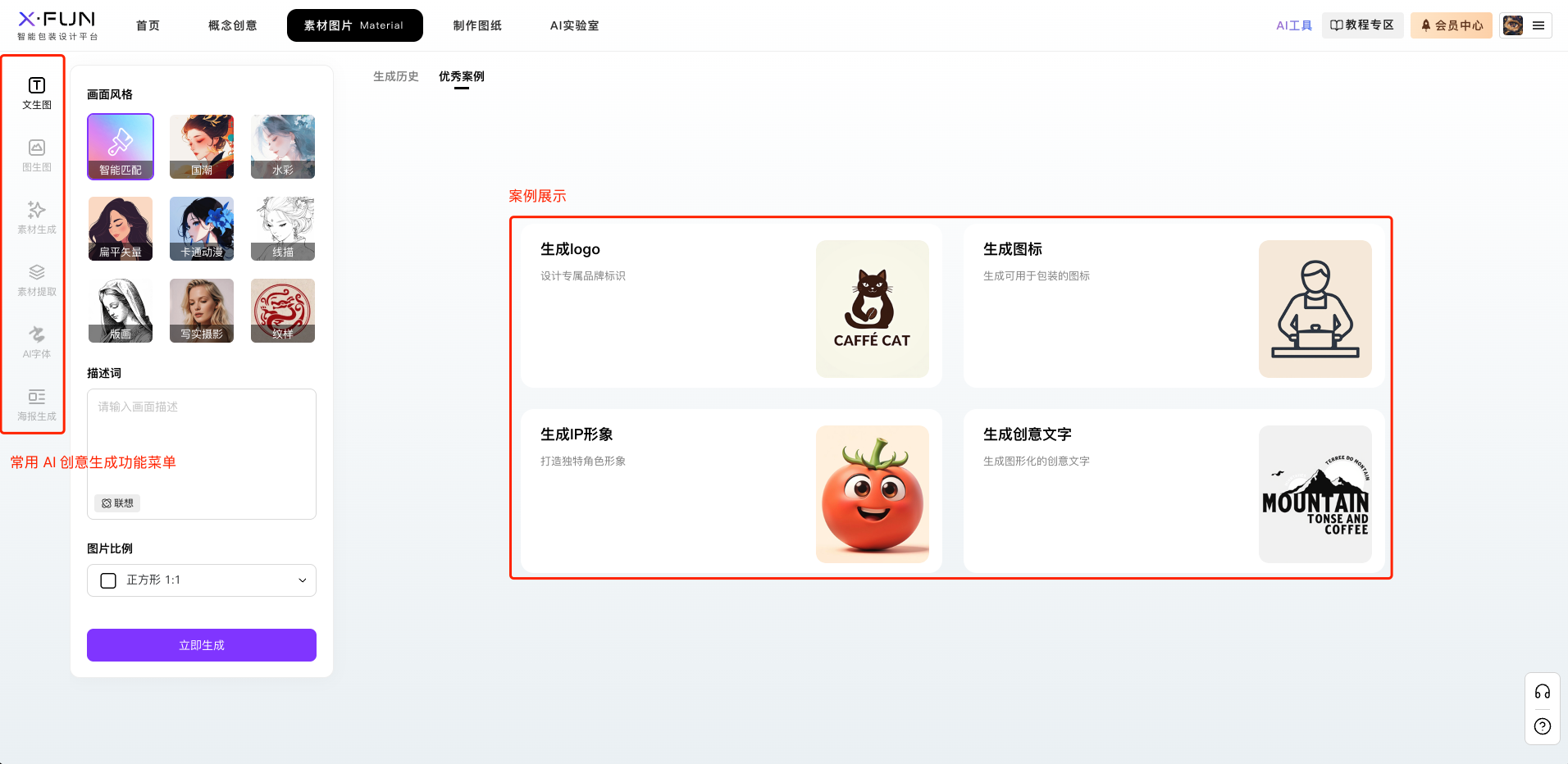 素材图片是 XFUN平台上用来生成各种图片、文字等设计素材的功能,在页面的左侧功能栏位置可以快速抵达各功能,满足各类设计需求。