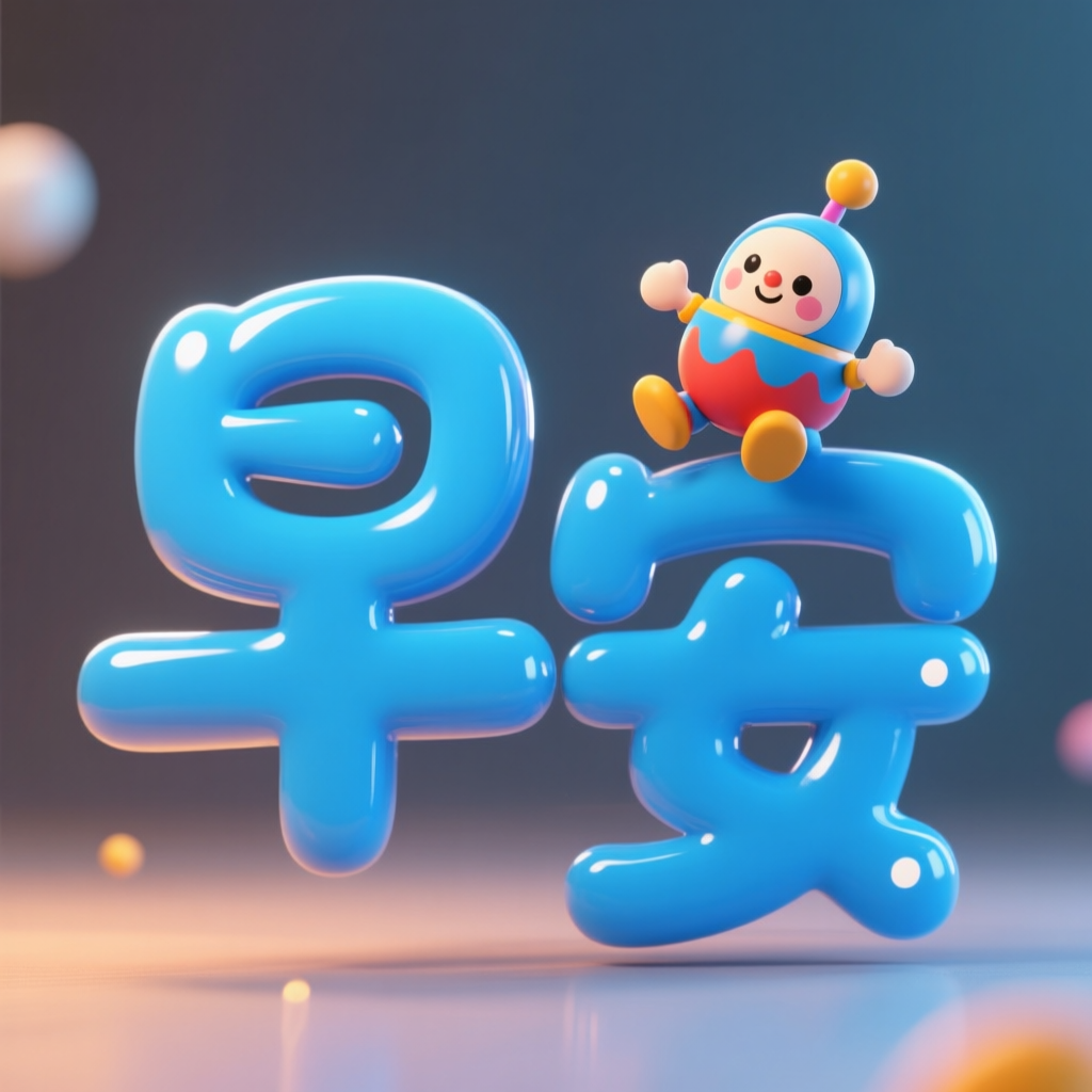 画面风格:智能匹配描述词:这是富有创意和趣味性的艺术字体文案:字体为蓝色,“早安”字上还有个正在玩乐的不倒翁玩偶,俏皮可爱。立体,饱满,有反光点