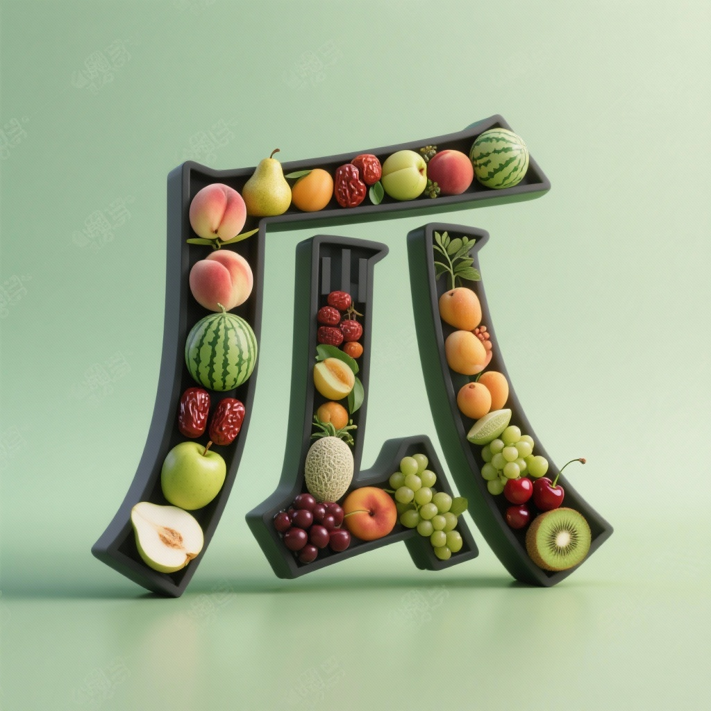 画面风格:智能匹配描述词:艺术字设计,山海机甲粗黑简体3D立体字“瓜”文字笔画内填满各种新疆水果如蟠桃,大枣,香梨,西瓜,哈密瓜,白兰瓜,苹果,杏子,葡萄,车厘子,猕猴桃等元素,浅绿背景有若隐若现田园水印,电影光线,高级感,高分辨率,杰作。