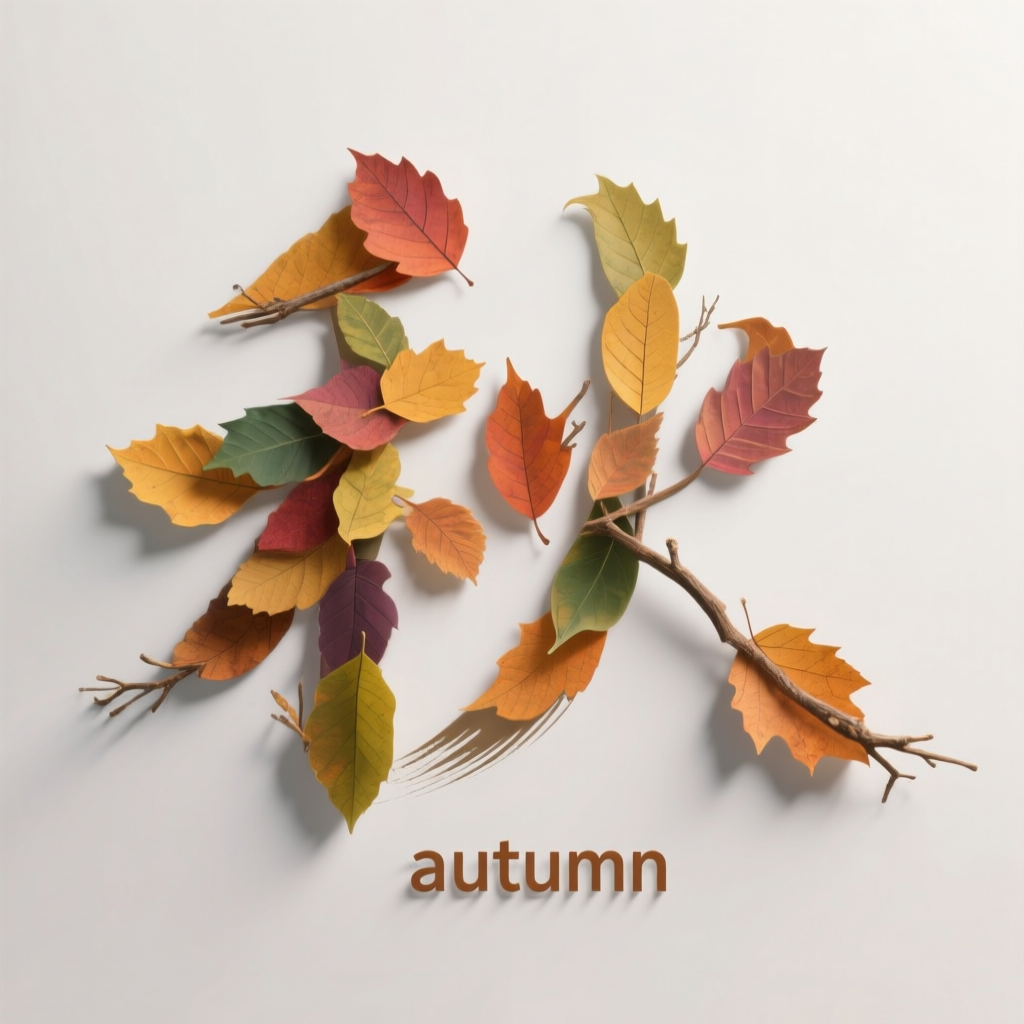 画面风格:智能匹配描述词:主体为一个由各种五彩树叶组成笔画的立体艺术汉字“秋”,文字局部由技条点缀,下面小字“AUTUMN ”,深度压痕效果,其他位置无任何文字或乱码,极简构图,大面积留白,高级审美,高清