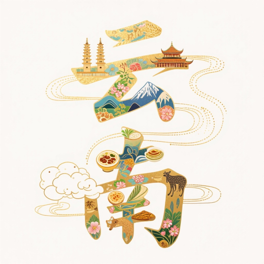 画面风格:智能匹配描述词:创意字体设计,点线画设计,金箔岩彩,文字“云南”,云南这两个字要有彩云之南的韵味,“云”字内穿插设计当地特色建筑,比如大理三塔、玉龙雪山、西双版纳,“南”字内穿插设计当地小吃,比如过桥米线、鲜花饼等。辅以能体现云南动物植物王国的图案、风景动物鲜花云等图案。