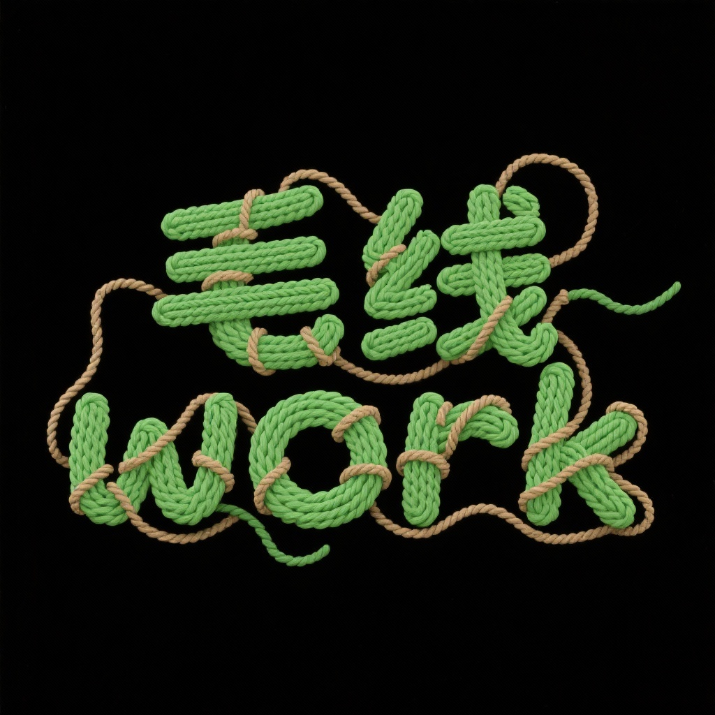 画面风格:智能匹配描述词:“毛线”“work”织物风格卡通字体,构造方式为 绿色的线缠字体结构 多层布纹扭动 字体像纺织机编织,结构细腻多维,搭配 织布纹理 缠绕麻绳图层,手工质感强烈,黑底绿字