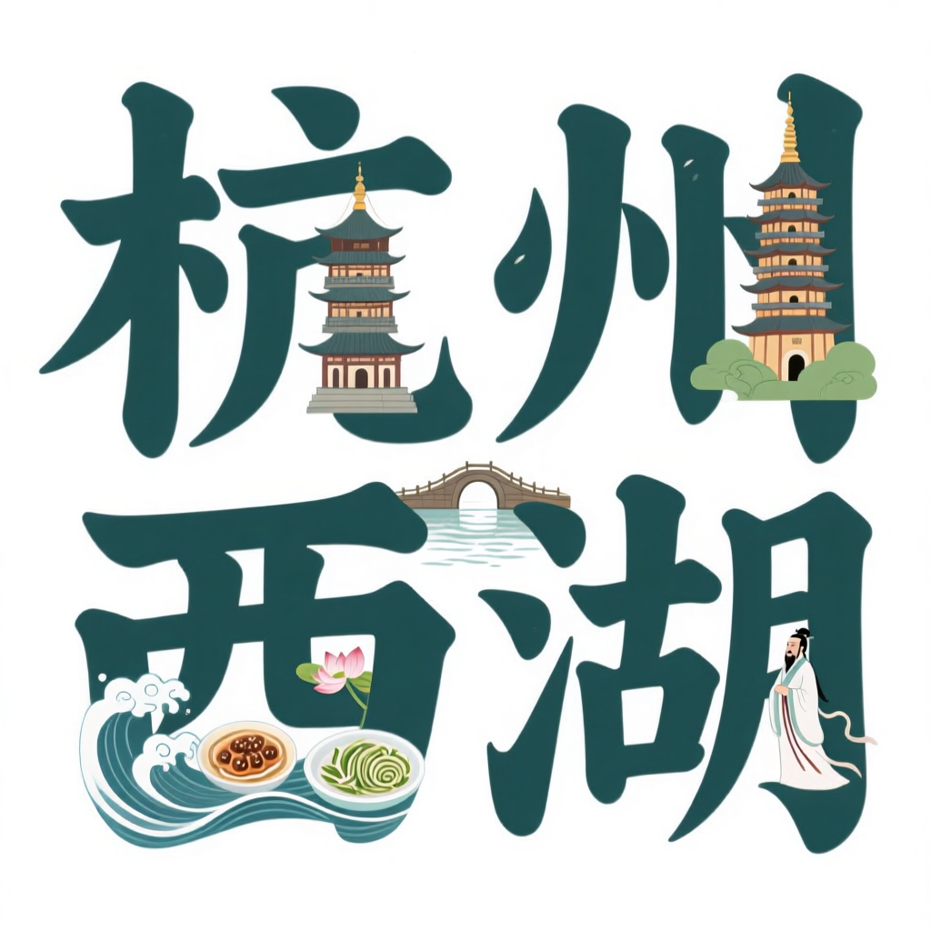 画面风格:智能匹配描述词:字体设计,创意字体设计,插画设计,文字“杭州西湖”,“杭” 字内穿插设计当地特色建筑, 比如雷峰塔、西湖醋鱼,“州”字内穿插设计当地小吃,比如莲子、龙须糖、龙井茶叶, “西”字内穿插西湖、断桥、白娘子,“湖”字内穿插人文景观,如杜甫、苏轼。辅以云纹,海浪等图案,白色背景