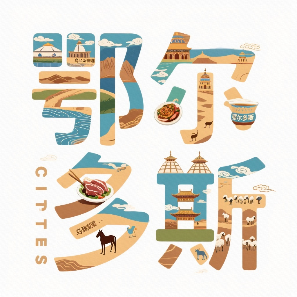 画面风格:智能匹配描述词:字体设计,创意字体设计,插画设计,文字“鄂尔多斯”,“鄂” 字内穿插设计当地特色建筑, 比如、乌兰木伦湖、黄河大峡谷、沙 漠,“尔”字内穿插设计当地小吃,比如手把肉、杀猪烩菜、 奶茶、 “多”字内穿插动物,马群、 羊群,“斯”字内穿插人文景观,成 吉思汗陵、伊克敖包、乌兰活佛府。辅以云纹,海浪等图案,白色背景